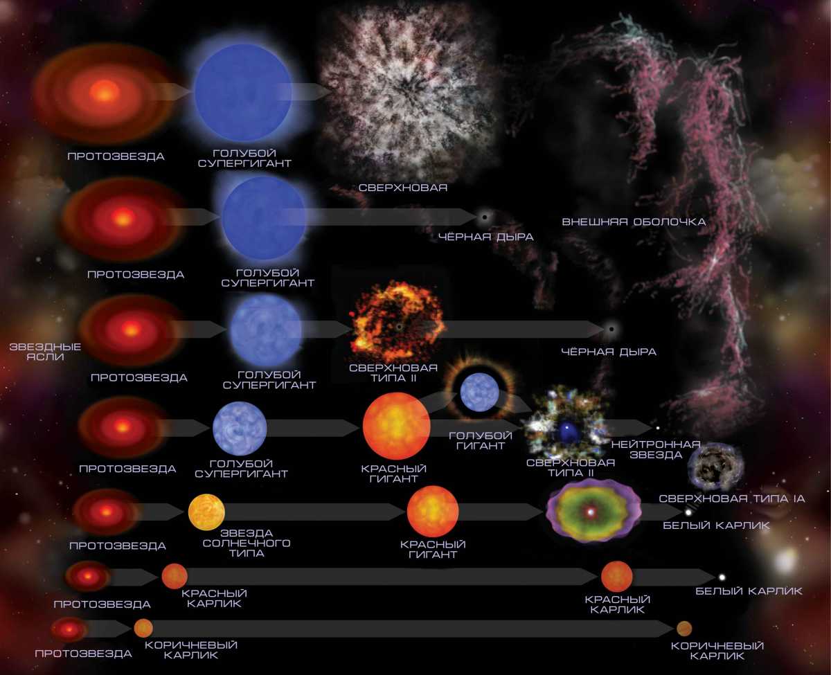 Для массивных звезд (более 8 масс Солнца). В случае более массивных звезд ситуация кардинально другая. После того как топливо в их ядре заканчивается, происходят более сложные ядерные реакции, в результате которых образуются тяжелые элементы, такие как углерод, кислород, неон и даже железо. Однако железо не может «сжигаться» в термоядерных реакциях, и звезда больше не может поддерживать свои размеры и устойчивость. Когда звезда не в состоянии поддерживать давление внутри себя, она переживает гравитационный коллапс, и вся ее масса начинает сжиматься в очень маленькую область. Это приводит к возникновению сверхновой — взрыва, который может быть настолько ярким, что на короткий промежуток времени он может затмить всю галактику. После взрыва сверхновой остаются различные варианты: если масса ядра звезды достаточно велика, то оно может превратиться в черную дыру — объект, чья гравитация настолько сильна, что даже свет не может покинуть его пределы. Если масса ядра недостаточна, образуется нейтронная звезда, чрезвычайно плотное небесное тело, состоящее в основном из нейтронов.