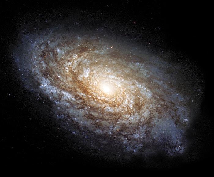 Самый распространенный тип — их больше половины. К спиральной относится и та, в которой мы живем. Спиральная галактика похожа на диск с желтым ядром, вокруг которого закручены по спирали вокруг центра рукава голубого оттенка. Рукавов, как правило, два, но может быть больше. Например, у нашей галактики Млечный Путь их пять. В центре находится основная масса вещества в виде черной дыры и скопления старых звезд (балдж). А в рукавах образуются новые звезды. В спиральных галактиках много межзвездного газа и пыли. Часто у таких галактик есть перемычка в центре («бар») — выпуклость, из которой расходятся рукава. Спиральные галактики обозначают буквой S. Они делятся на типы по плотности расположения рукавов, от большей к меньшей: Sa-Sd, галактики с перемычкой — SBa-SBd. Есть еще один тип S0 — это линзообразные галактики, промежуточный тип между эллиптической и спиральной. У них есть ярко выраженный балдж в центре, но нет рукавов.
