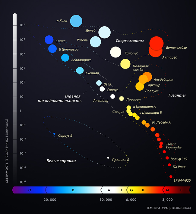 Об этом типе звезд знают далеко не все. И это странно, ведь наше родное Солнце — это типичный желтый карлик. Желтые карлики — небольшие звезды, масса которых составляет 0,8–1,2 солнечной. Это светила так называемой главной последовательности. На диаграмме Герцшпрунга—Рассела это область, которая содержит звезды, использующие в качестве источника энергии термоядерную реакцию синтеза гелия из водорода.