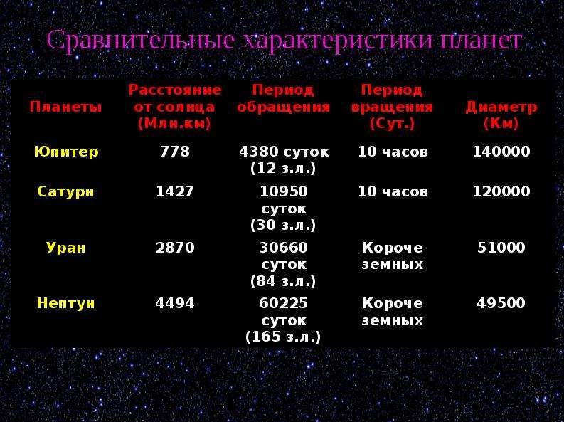 Планеты группы газовых гигантов расположены на большом отдалении от Солнца. Их температуры значительно ниже земных. Этот факт они смогли использовать для своего формирования, нарастив массу за счет гравитационного притяжения газа из окружающего их пространства. Данный процесс называется аккрецией. Сегодня газовые гиганты являются самыми большими планетами Солнечной системы. Их характеристики можно посмотреть в таблице ниже: